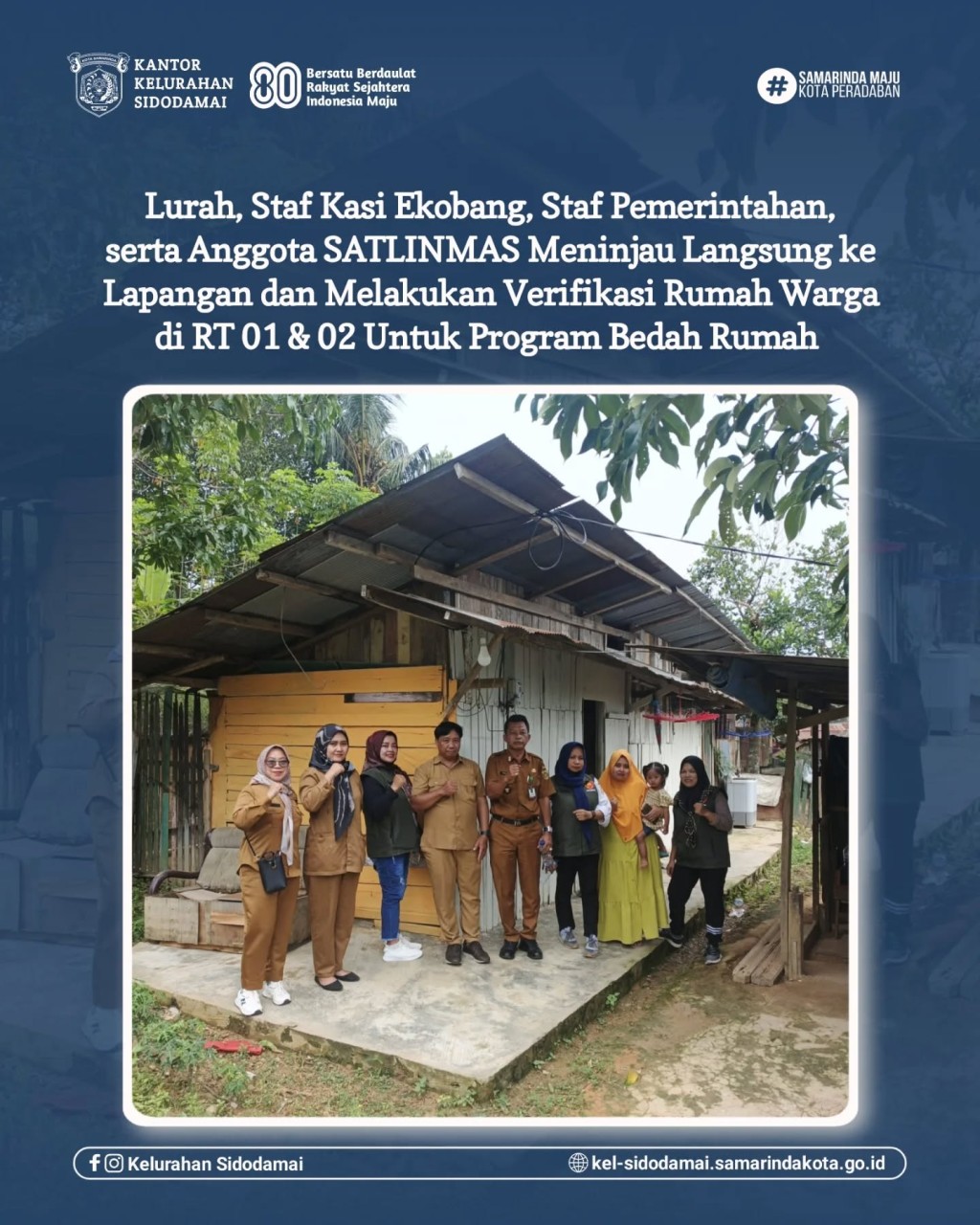 Agenda pertama, Lurah Sidodamai, Bapak Tisna, S.E., bersama Kasi Ekonomi dan Pembangunan (Ekobang), staf pemerintahan, Ketua RT, dan anggota Linmas, melaksanakan peninjauan lapangan serta verifikasi rumah warga di RT 01 dan RT 02, Jalan Jelawat Gang 9. Kegiatan ini merupakan bagian dari program Bedah Rumah, yang bertujuan meningkatkan kualitas tempat tinggal warga kurang mampu agar lebih layak huni dan sehat. Peninjauan dilakukan secara menyeluruh untuk memastikan kelayakan penerima manfaat sesuai dengan ketentuan dan kriteria yang berlaku.